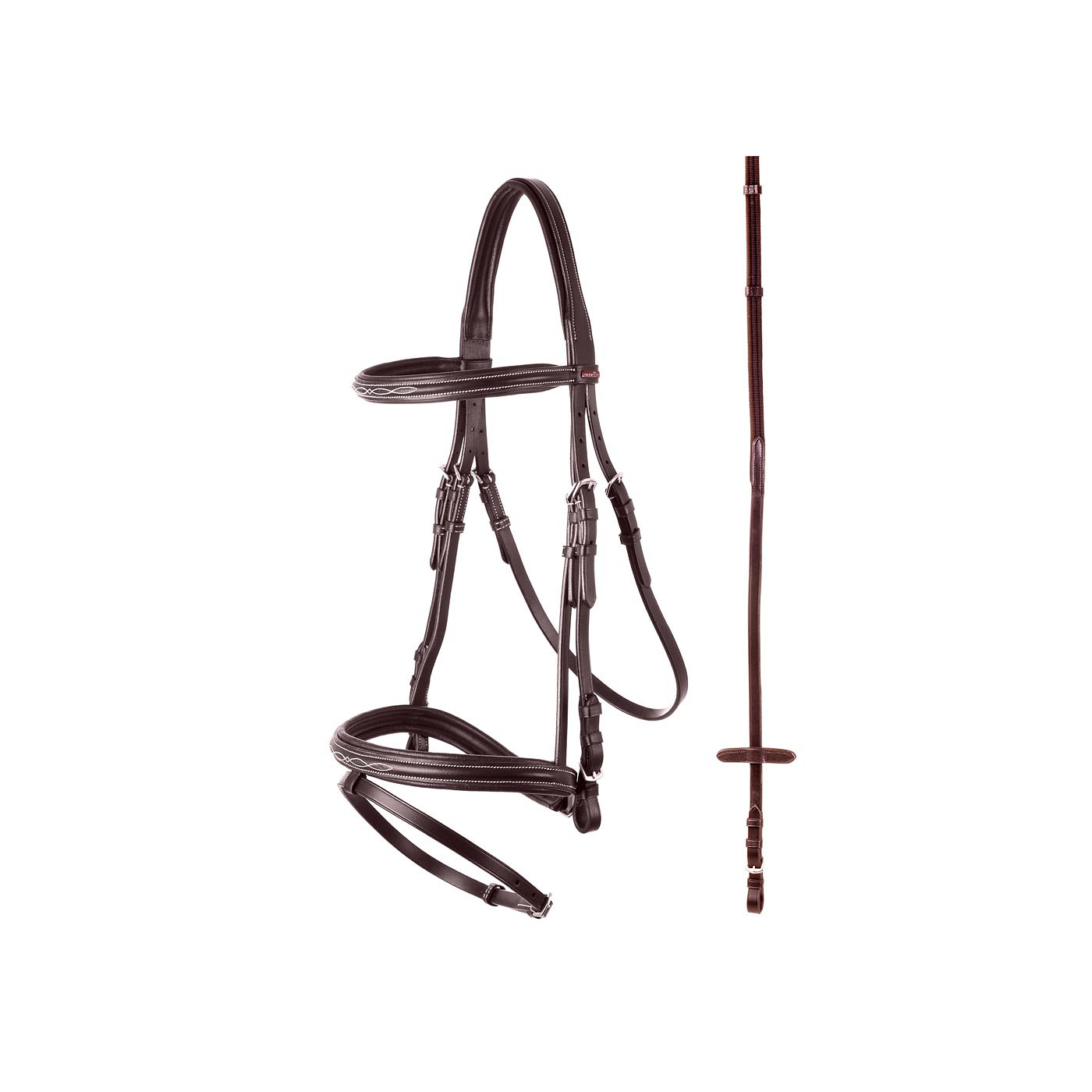 Symmetric bridle with an anatomically formed crownpiece with soft padded lining, which is cut back at both sides. The straight browband is round raised and has cream fancy stitching and soft padded lining. Its small (± 2.5 cm) flash noseband is round raised with cream fancy stitching and soft padded lining. The bridle has stainless steel fittings. The included web rein has hand and rein stops and hook stud billets.