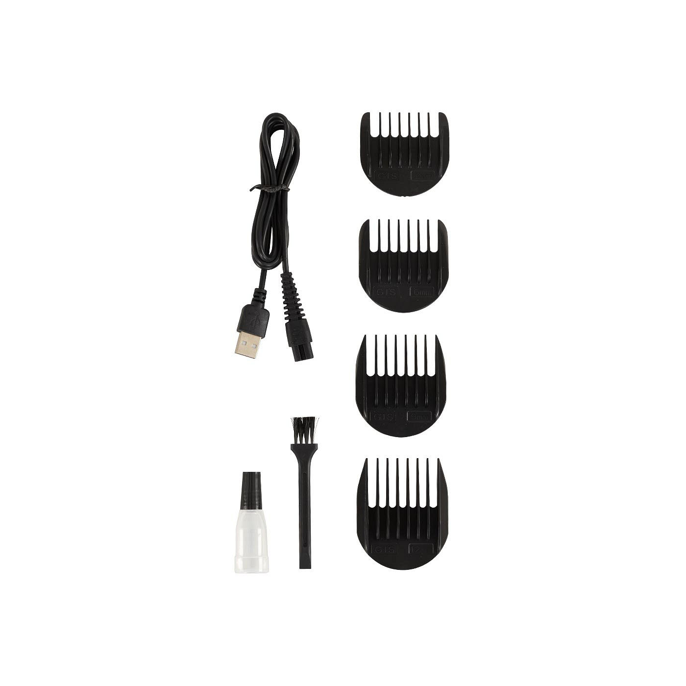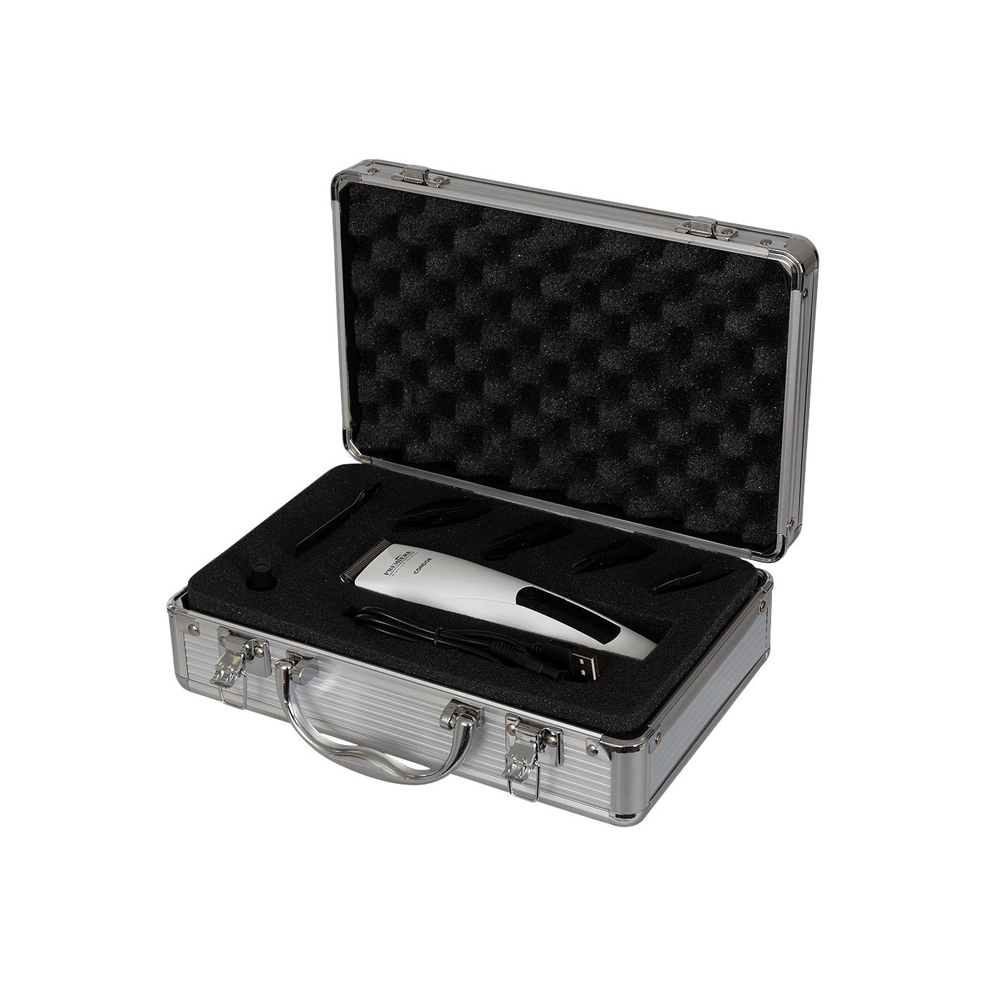 The clipper has a practical slide switch, which can be turned to adjust the cutting length (0.5 to 2 mm). In addition, the trimmer is supplied with four attachment combs, which can be used to increase the cutting length with 3, 6, 9 and 12 mm respectively. The clipper comes in a luxurious aluminium case including oil and cleaning brush.
