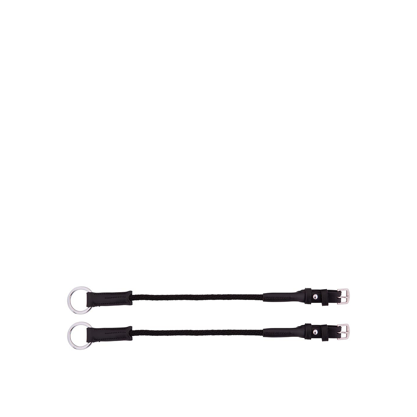Gag cheekpieces with cord and leather for gag bits (16 mm). One end with 16 mm leather cheek part with stainless steel buckle and screw system. Other end with stainless steel rings. The total length is 35 cm. Per pair. PU 3.