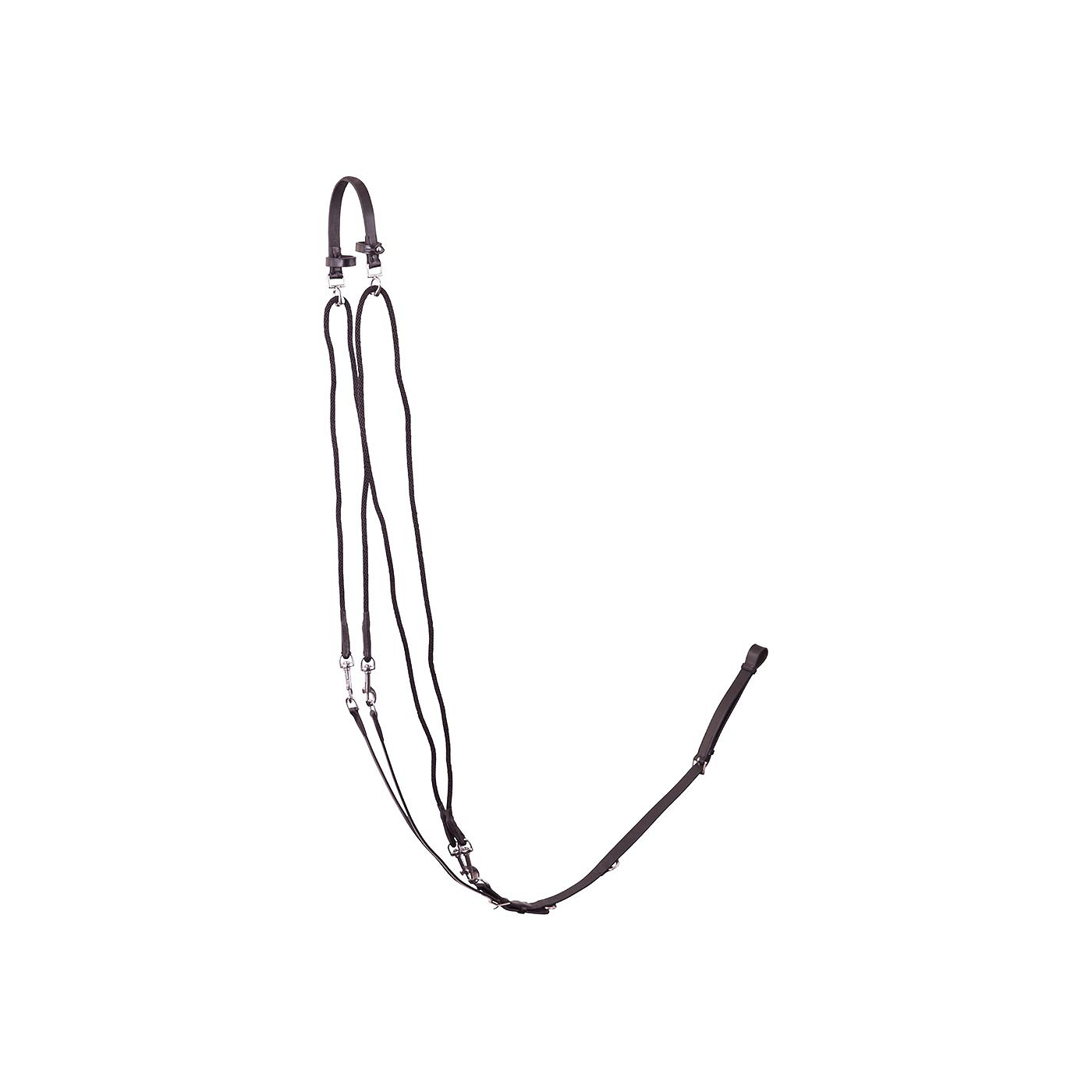 Leather gogue with adjustable girth attachment loop with buckles closure and three D-rings: one at the end and two at the breast part for more adjustment options. The soft nylon cords are attached with snap hooks and go through the bitrings to the rings (with roller buckles) on the leather headpiece back to the breast part of the gogue, where they are attached to one of the three D-rings using a snap hook. In this way, a triangle is formed, which prevents the horse from extending its neck too far ahead. The gogue is fitted with stainless steel fittings. The gogue can be used while riding and longeing and makes sure that your horse decontracts and walks in a relaxed position. If the horse raises its head, pressure arises behind the ears and in the corners of the mouth, which causes the horse to lower its head.