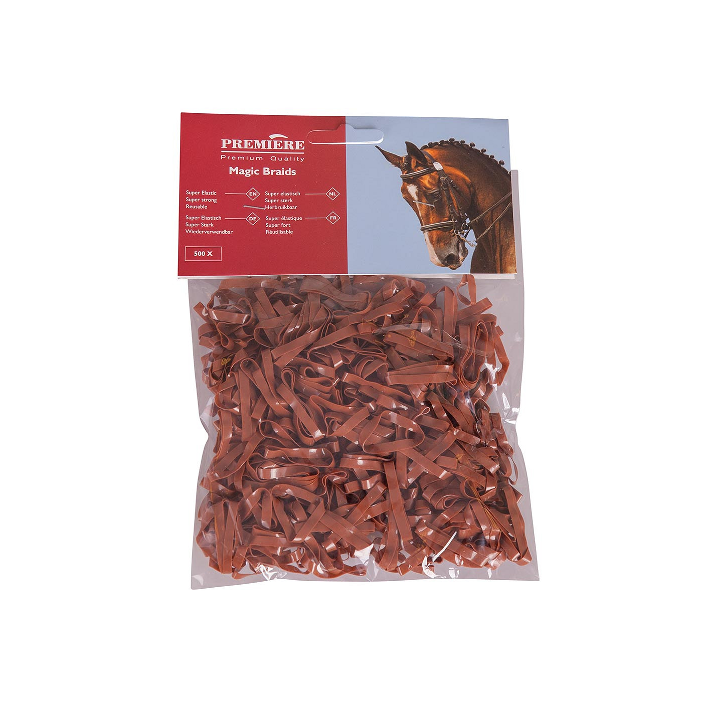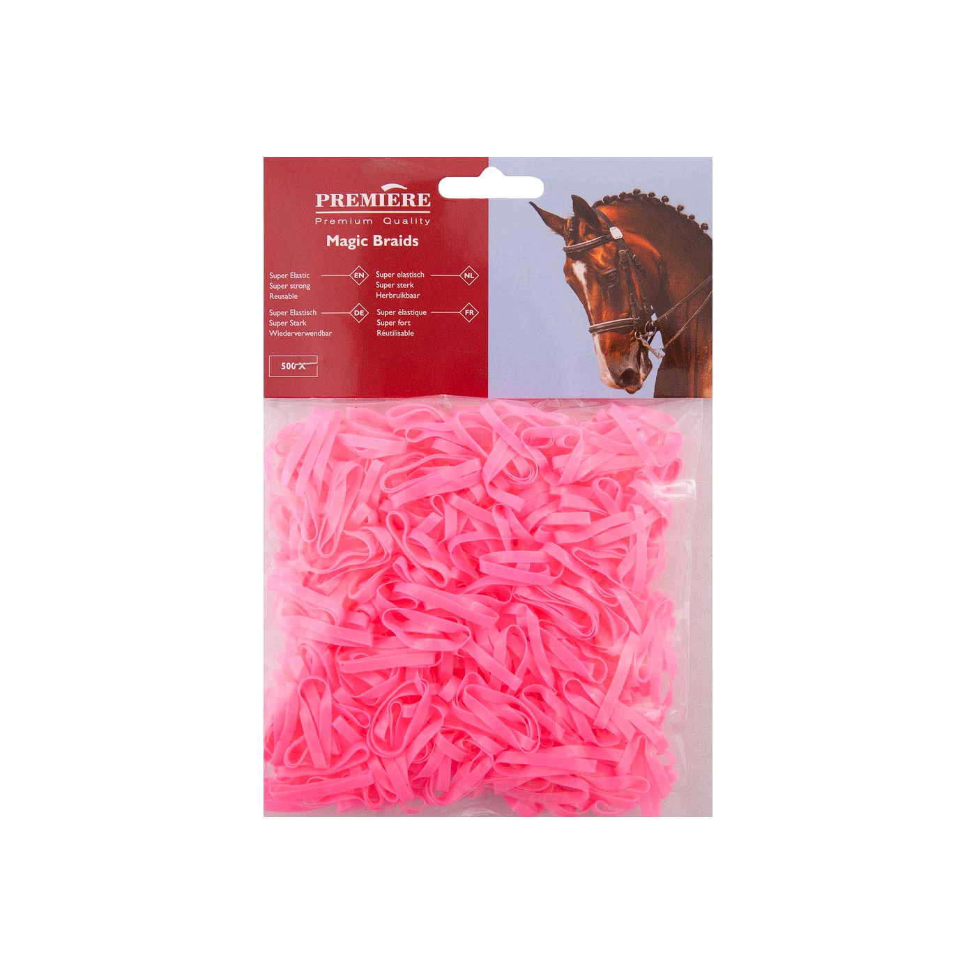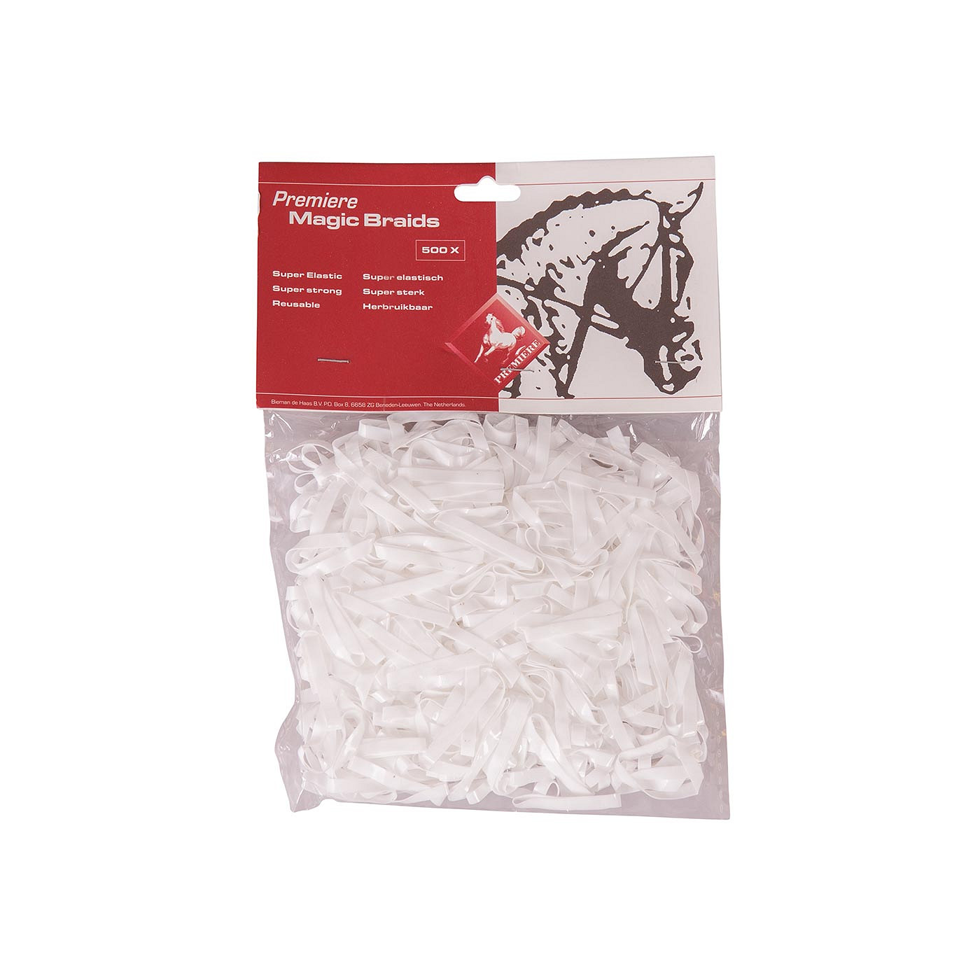 Reusable mane plaiting bands to plait the horse’s mane. The plaiting bands are very elastic, super strong and soft to the hands and mane (the plaiting bands don’t cut in your fingers). A bag contains approximately 500 plaiting bands.