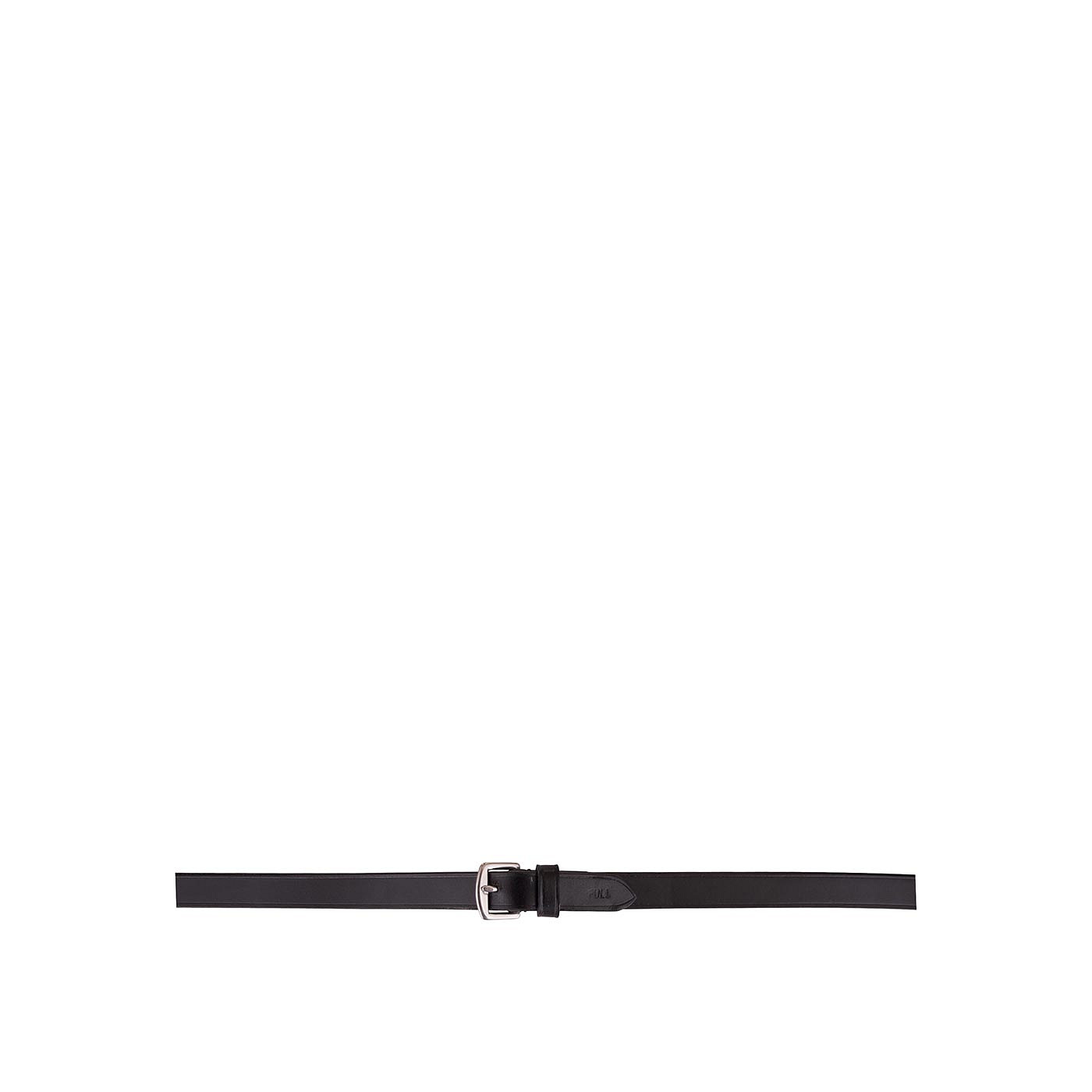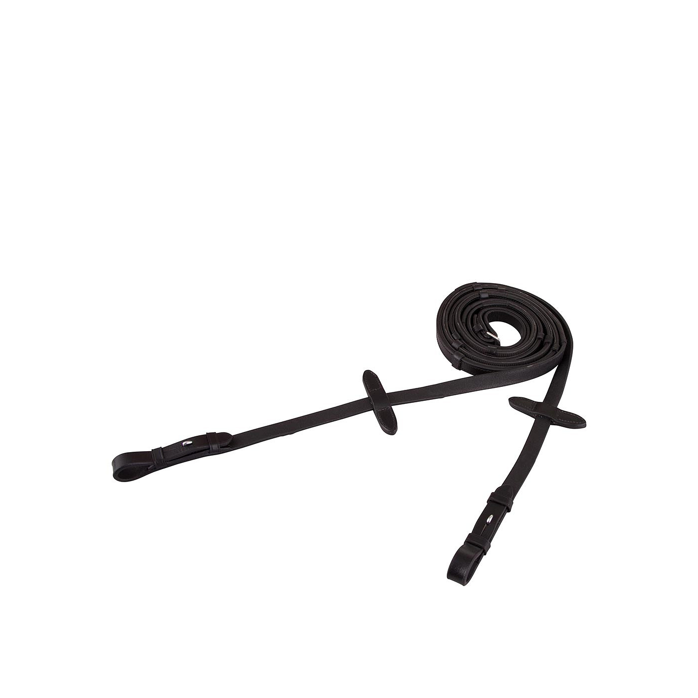 Leather dressage rein (16 mm wide) with rubber on the inside and leather hand stops for improved grip. Its leather ends, with hook stud billets, are also 16 mm wide.