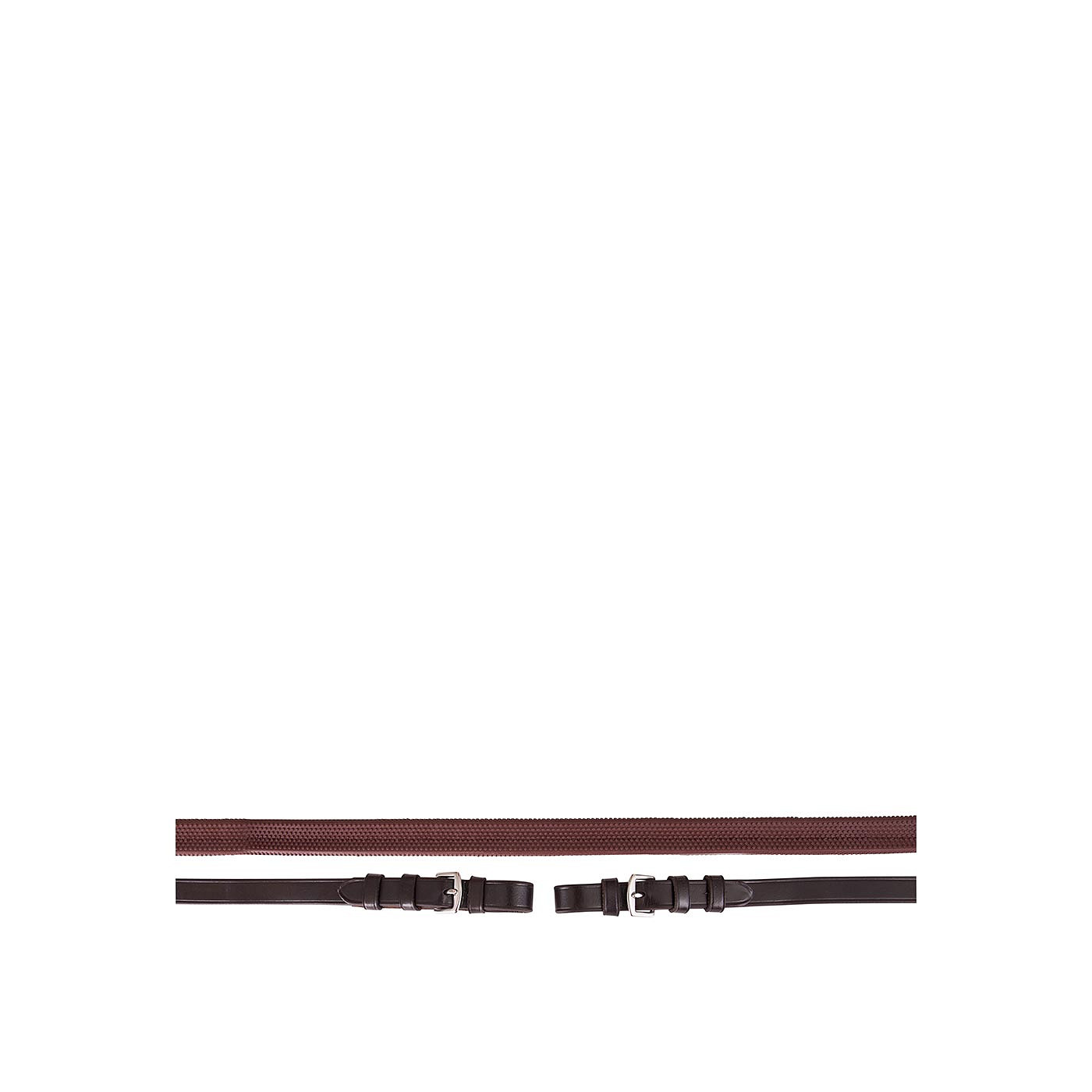 Rubber grip rein (16 mm wide) with leather rein stops and strengthened with nylon. The leather ends, with stainless steel buckle closure, are also 16 mm wide.