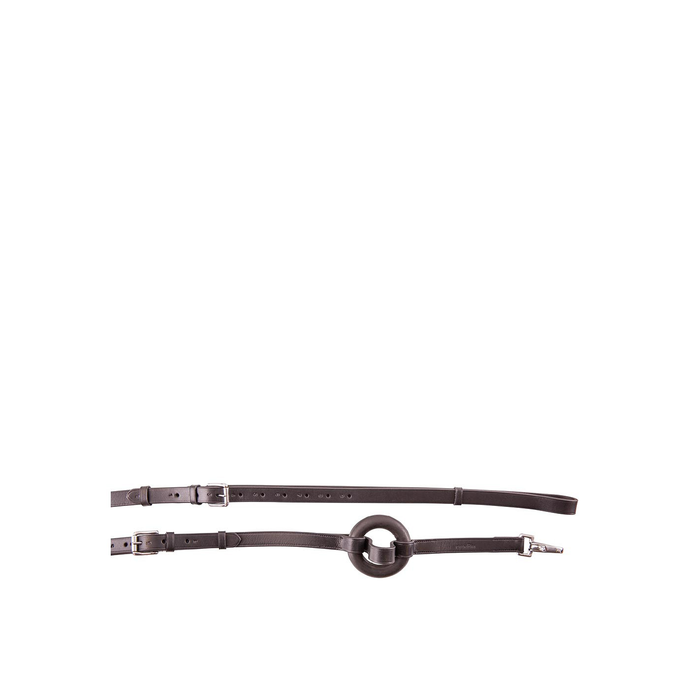 Leather side reins (19 mm) with rubber ring which ensures that the rein will give way when your horse moves. The closures are freely adjustable and fitted with buckle closure. The snap hooks are attached to the bitrings. The side rein is fitted with stainless steel fittings. The side rein serves to improve a horse’s balance vertically or horizontically and is used to teach the horse to decontract and find balance in the lateral bend of its body. The side rein can be used while riding and longeing.