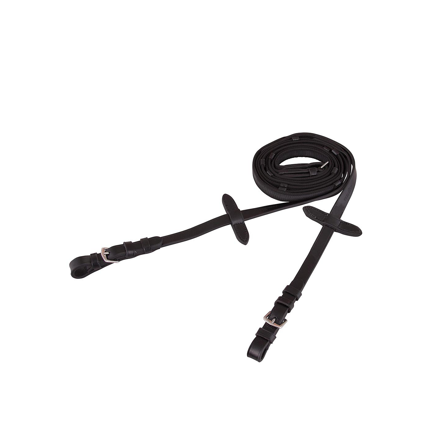 Web rein wrapped with rubber for improved grip. This non-skid rein (19 mm wide) has leather hand and rein stops. Its leather ends, with stainless steel buckle closure, are 16 mm wide.