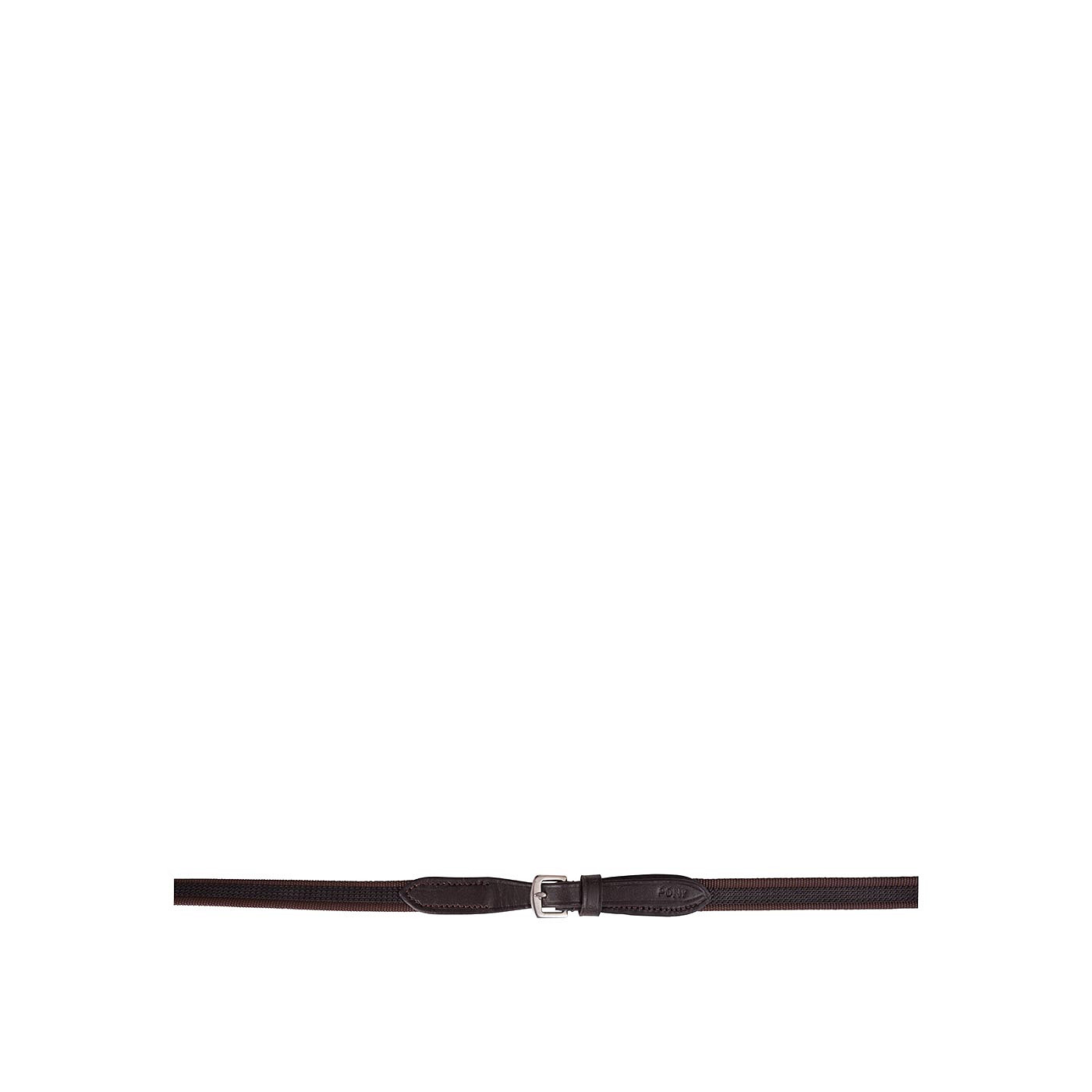 Web rein wrapped with rubber for improved grip. This non-skid rein (16 mm wide) has leather hand and rein stops. Its leather ends, with stainless steel buckle closure, are 13 mm wide.