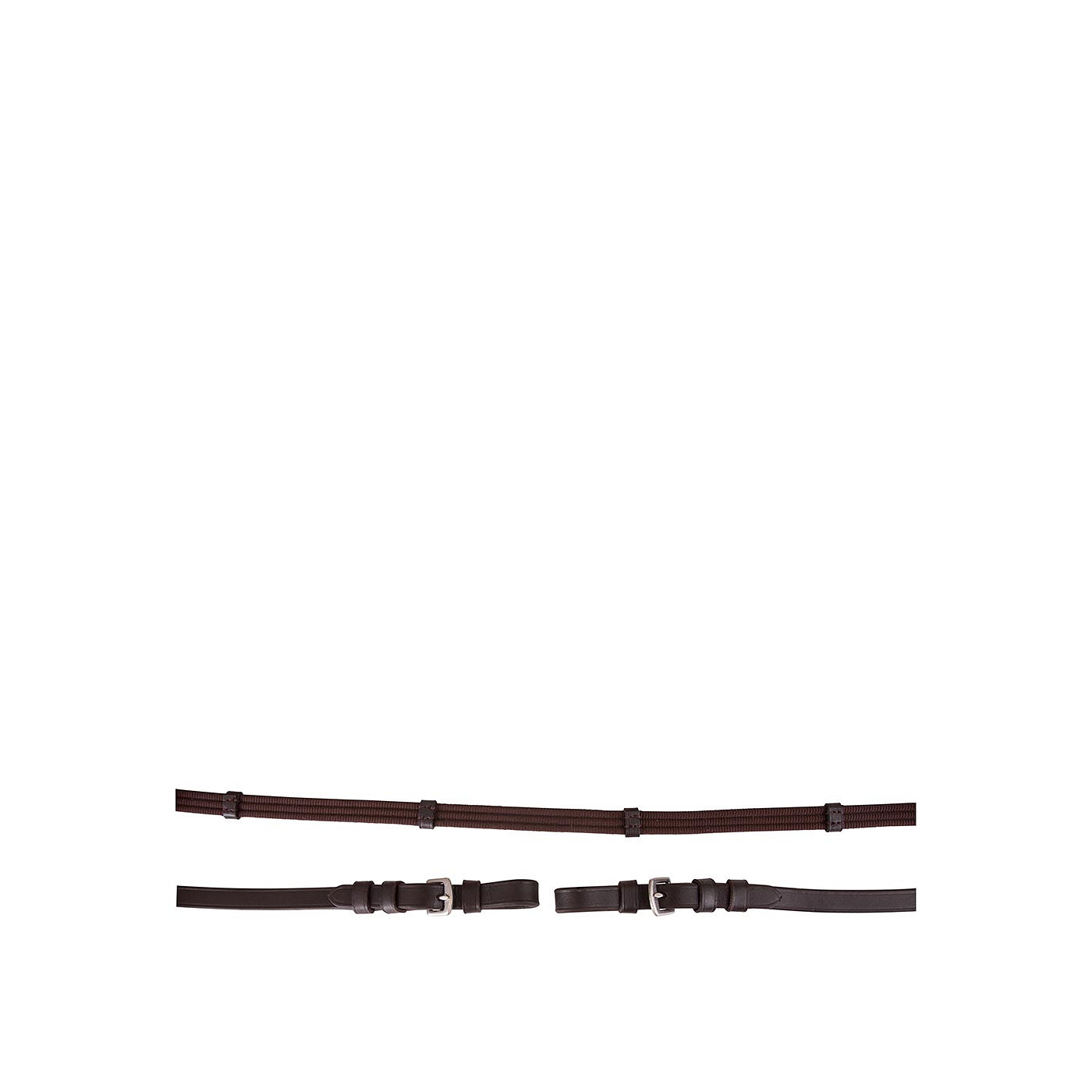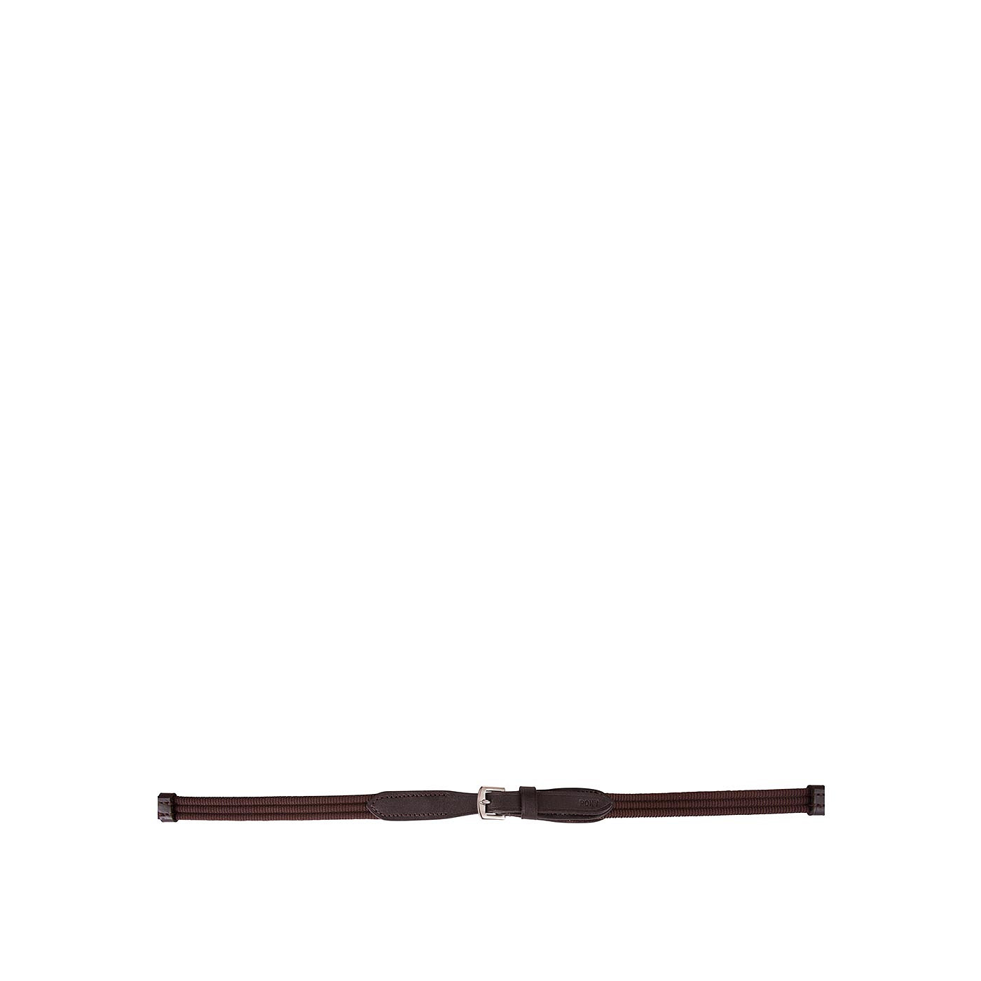 Web rein (16 mm wide) with leather hand and rein stops. Its leather ends, with stainless steel buckle closure, are 13 mm wide.