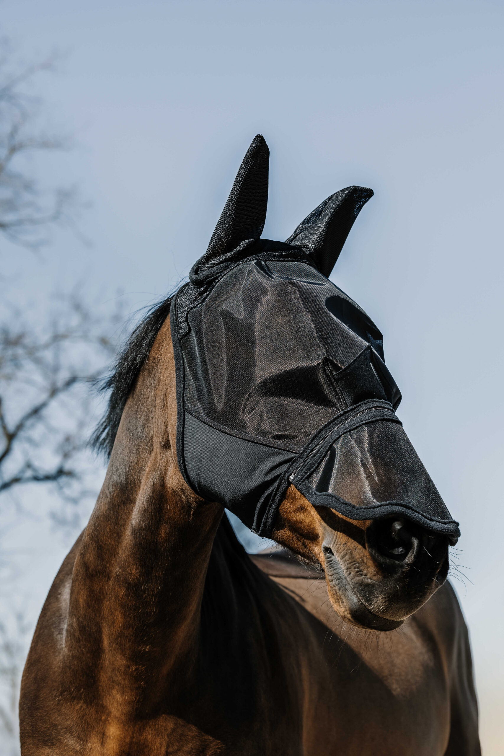 An innovative construction for maximum comfort and unrestricted vision. – Effective barrier: Protects against insects and sun rays with UV 50 protection. – Ergonomic shape: Balloon-shaped structure keeps the mask away from the horse’s head to prevent rubbing on the eyes. – Adjustable protection: Equipped with a removable, zippered nose guard. – Adjustable: Attaches to the throat latch with two hook-and-loop fasteners. DETAILS: – Fleece edging – Wide-field-of-vision design. COMPOSITION: 100% Polyester.