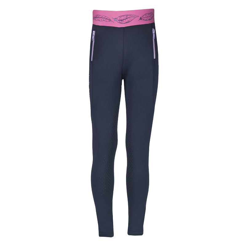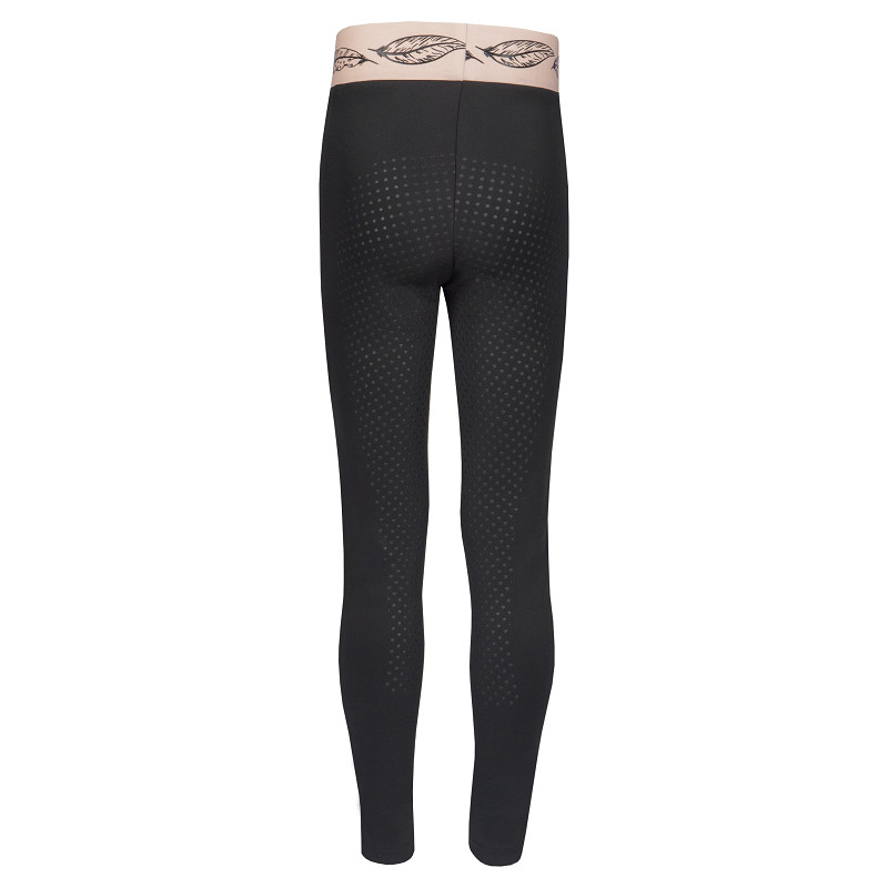 Junior riding leggings with an all-over dotted silicone seat and a feather print waistband. Product specifications: Bohemian-style artwork on left side pocket Feather print on waistband Two zip pockets All-over dotted silicone seat Material: < 96% Polyester 4% Spandex 320 gsm