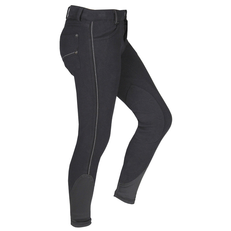 Cool boys’ riding breeches with fabric knee patches made of cotton. The breeches are designed with a jeans pocket and contrasting stitching. Product specifications: Boys’ riding breeches Jeans pocket Contrasting stitching Fabric knee patches Material: 92% cotton 8% elastane – knitted