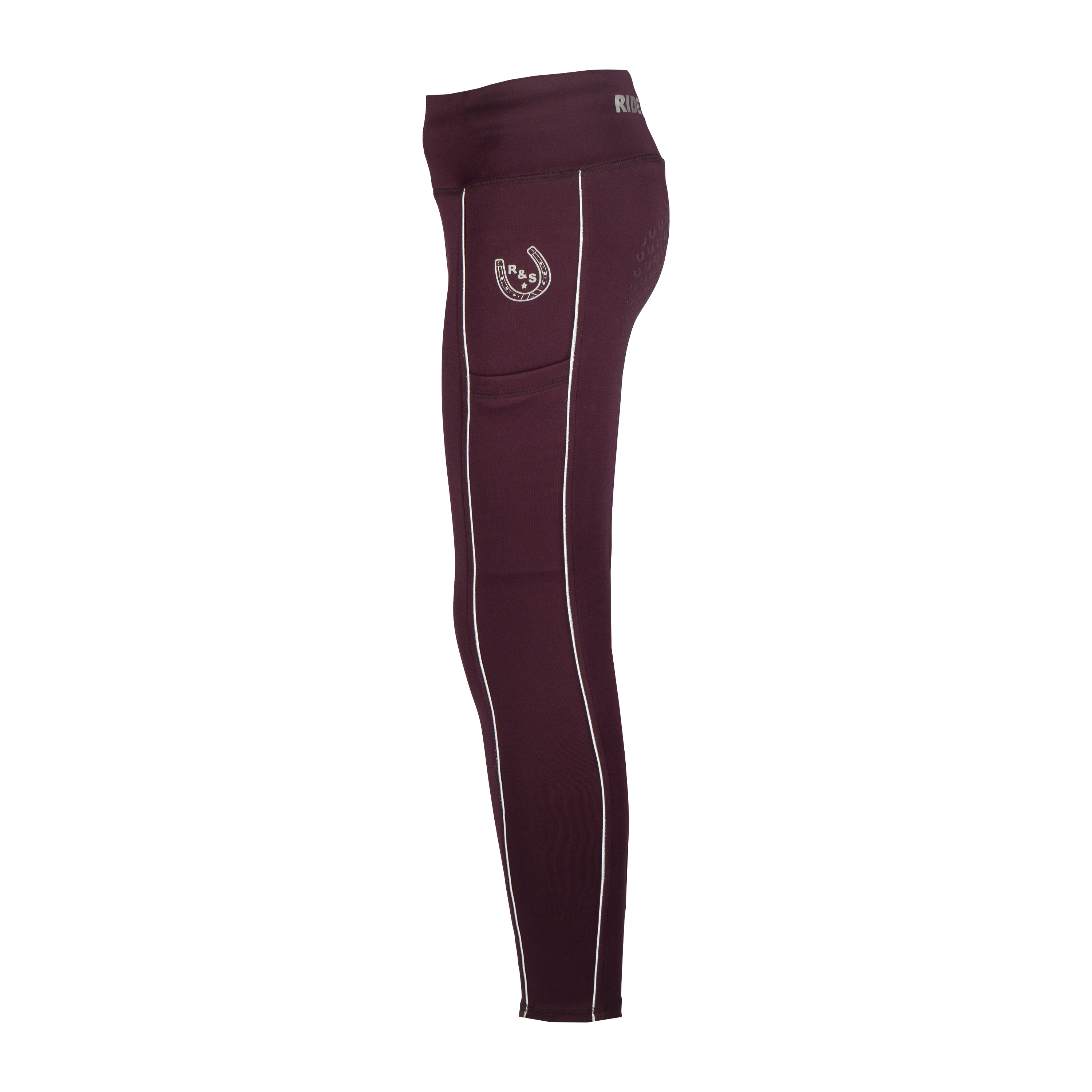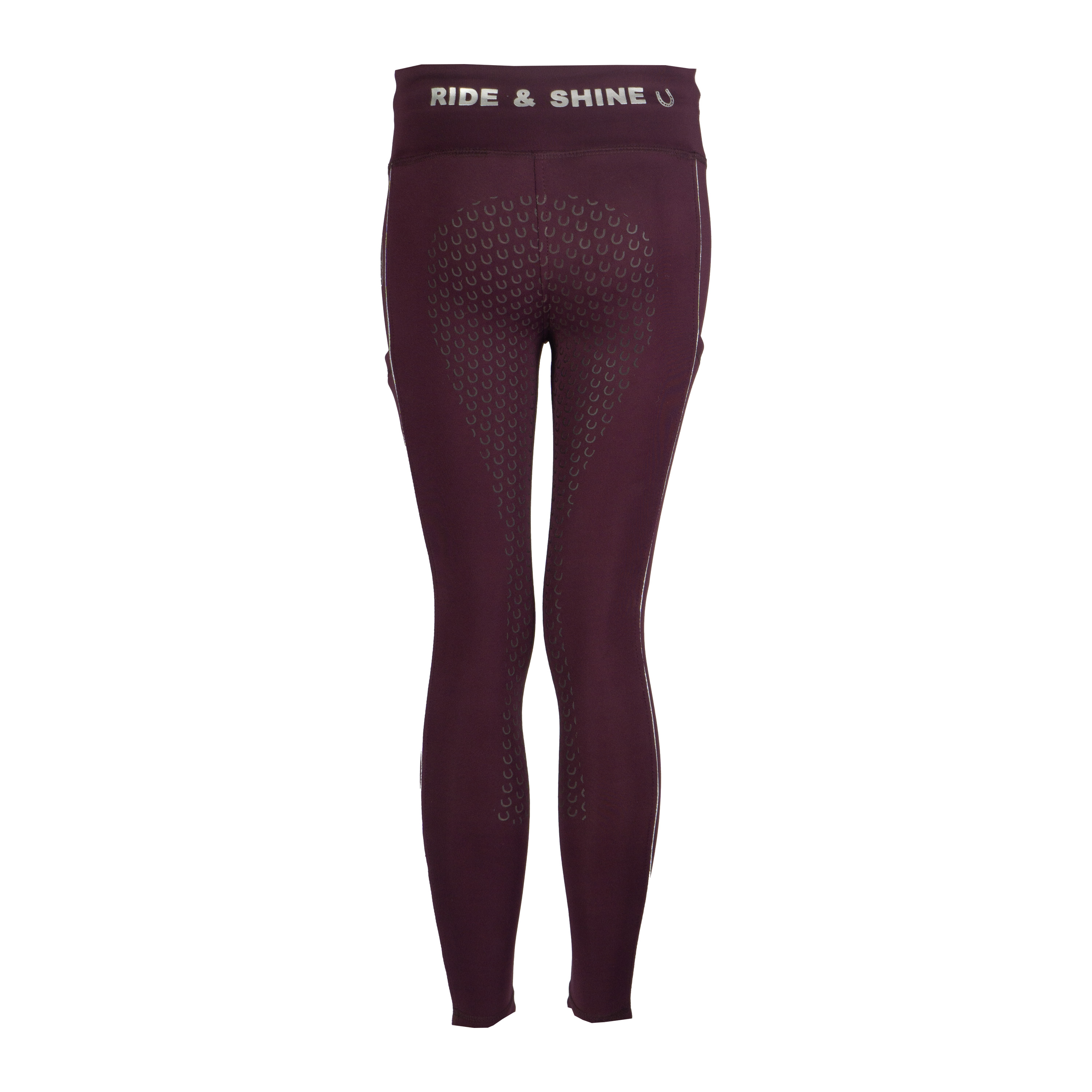 Stylish riding leggings made of high-quality stretch fabric. The leggings feature a wide waistband with an inner drawstring and a slightly matte silicone seat for extra grip in the saddle. Product specifications: Wide waistband with drawstring Rose gold or silver details Slightly matte silicone seat Available in children’s and women’s sizes Material: 85% Polyester 15% Elastane 350 gsm knit