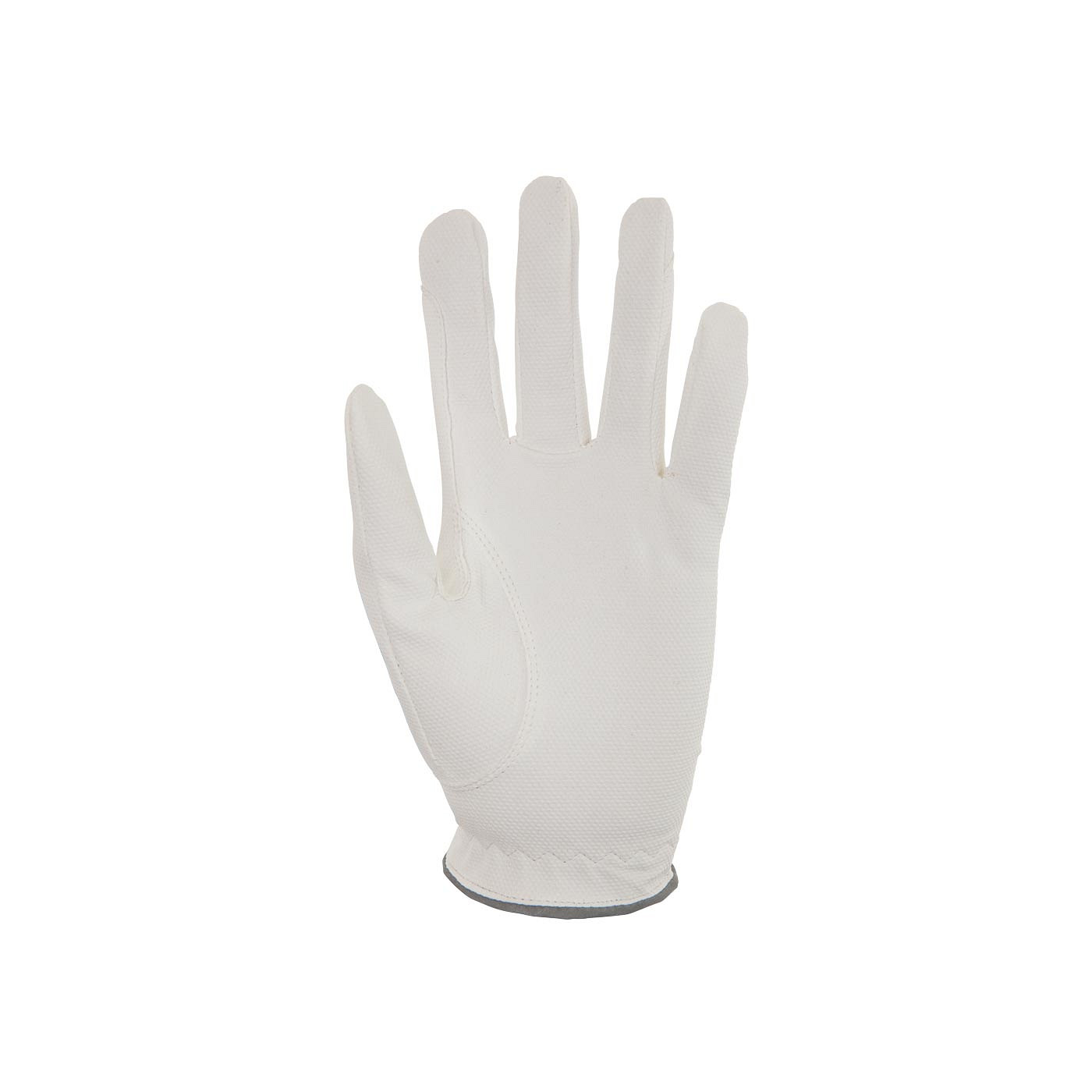 Stylish, synthetic leather riding gloves. The durable, anti-slip material gives optimal grip. The gloves feature rein reinforcement, an elasticated wrist for a close fit and an adjustable Velcro closure. The gloves are trimmed with a subtle, reflective piping in combination with elegant, imitation diamonds. Per pair. Machine washable.