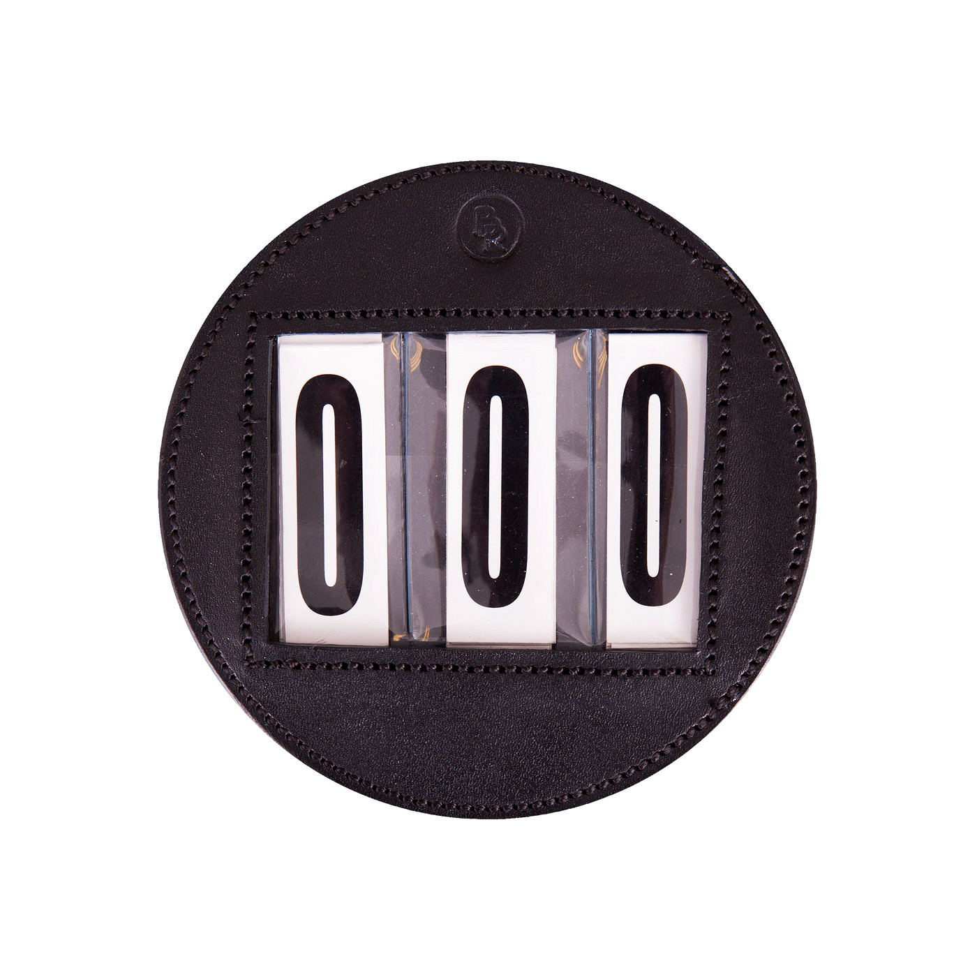 Competition number in round leather holder, can easily be attached to the bridle by means of two Velcro closures. Can also be attached to the saddle pad by means of a big safety pin. The numbers are clearly legible and can be changed from 000 to 999. The luxurious holder has a diameter of 11 cm.