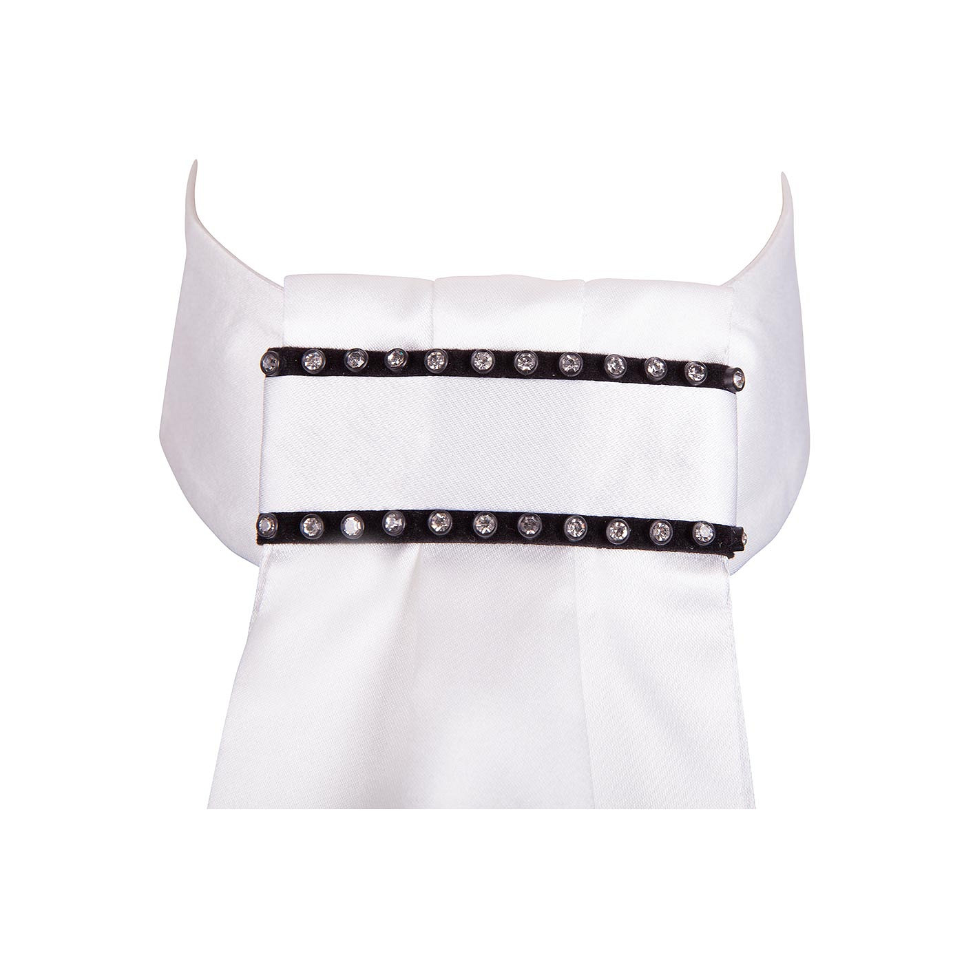 Luxurious stock tie for kids of high-quality shiny satin. The middle of the stock tie has been fitted with two black stripes with imitation diamonds. The bottom of the stock tie has been decorated with a silver-coloured BR embroidery. This extremely convenient stock tie is ready tied and does not need a stock pin. Can easily be fastened around the collar of the competition shirt or competition blouse by way of the Velcro closure at the back. Material: 100% polyester satin.