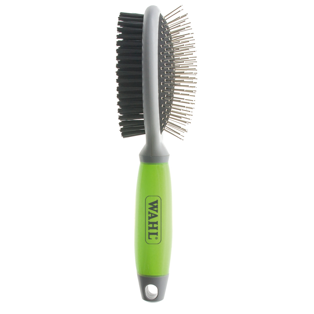 - 2-in-1 brush with stainless steel pins on one side for removing loose hairs and plastic bristles on the other side for a shiny coat